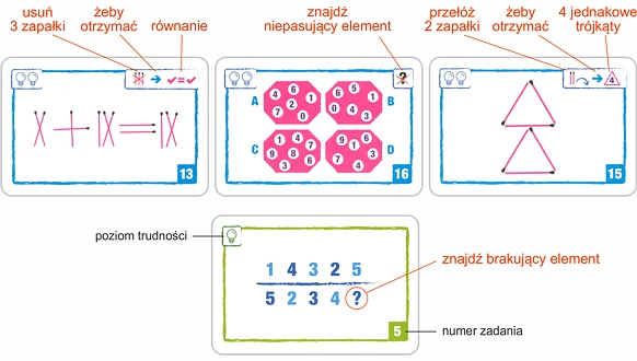 Logic Cards to zestawy kart z zadaniami matematycznymi oraz wymagającymi nieszablonowego myślenia zagadkami logicznymi. Przypominają one zadania znane z różnego rodzaju testów na inteligencję. Mają 5 poziomów trudności, dzięki czemu każdy znajdzie tu coś dla siebie.
