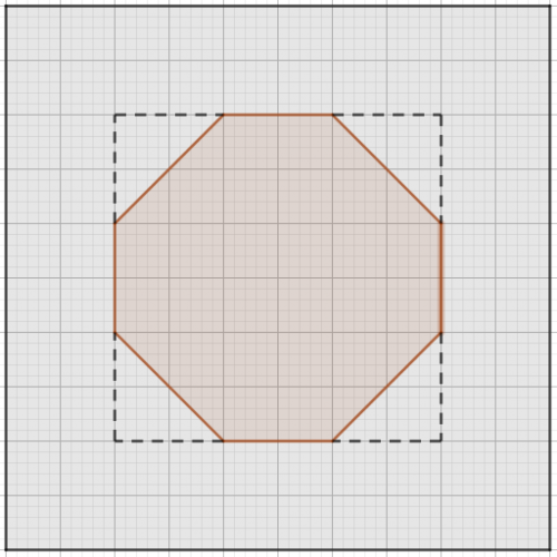 Zad. 2. Wyznaczony wielokąt to ośmiokąt, który możemy zamknąć w kwadracie o boku 6. Przy każdym dłuższym boku powstaje trójkąt prostokątny o przyprostokątnych 2 cm, więc o polu ½.2.2 = 2 cm2. Pole ośmiokąta jest równe 62–4.2 = 28 cm2.